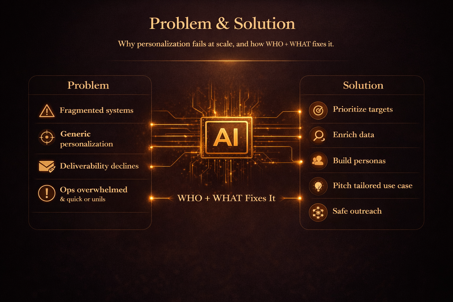One pipeline. WHO persona per lead. WHAT pitch per persona. Fully trackable and safe to run at scale.